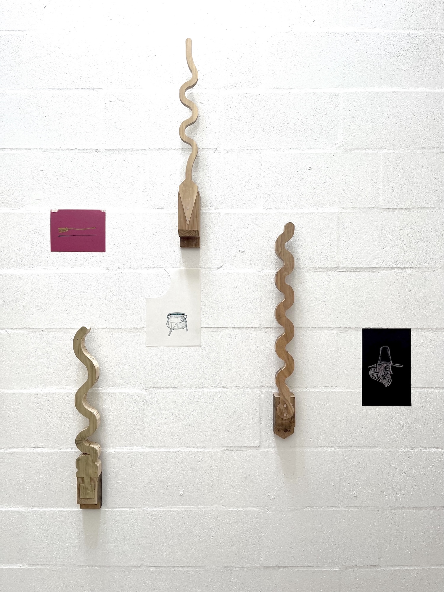 The drawings shown alongside these sculptures were part of the initial research into the history of brewing. They reference significant alewives such as Elynour Rummyng and Mother Louse; a broomstick, which may be a more historically accurate depiction of an alestaff; a bottle of gira, a malted drink linked to early fermentation processes; and a posset, a ceramic vessel used to hold a celebratory drink made from ale mixed with custard.